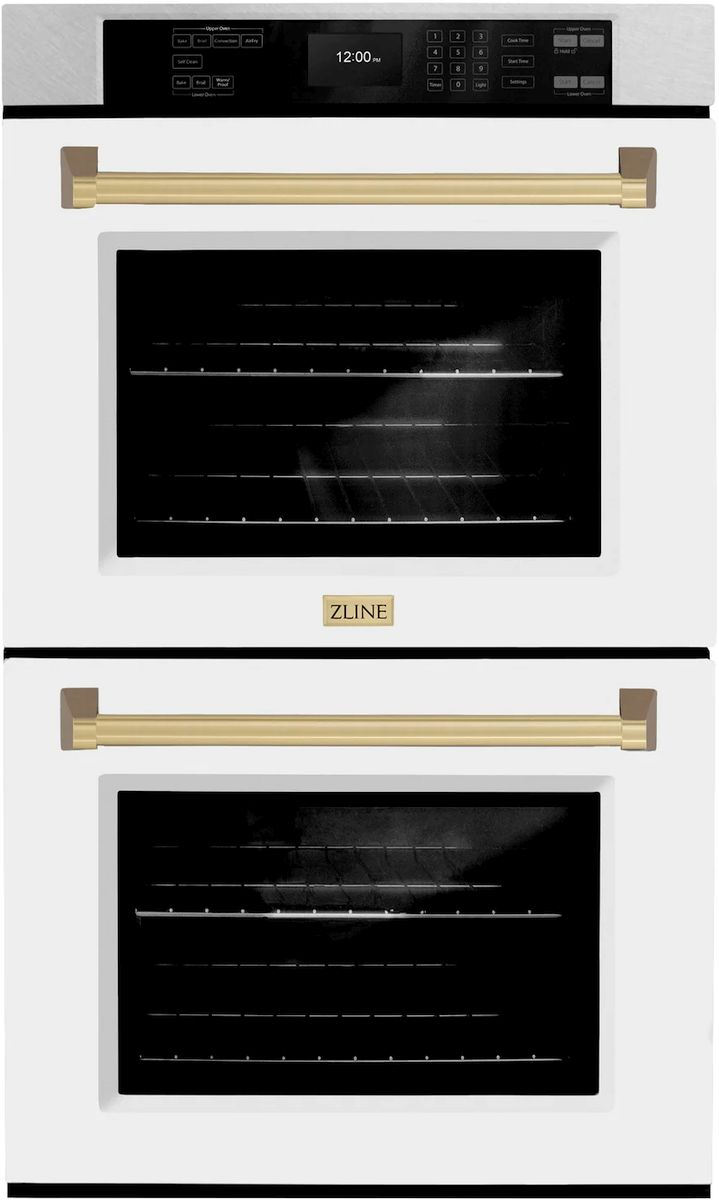 The ZLINE 30 in. Autograph Edition Professional True Convection Double Wall Oven with Air Fry and Self Clean in Satin Stainless Steel with White Matte Doors and Champagne Bronze Handles (WADSZ-WM-30-CB) provides a professional culinary experience by pairing reliable, everyday performance with contemporary convection cooking capabilities and cutting-edge air frying technology.