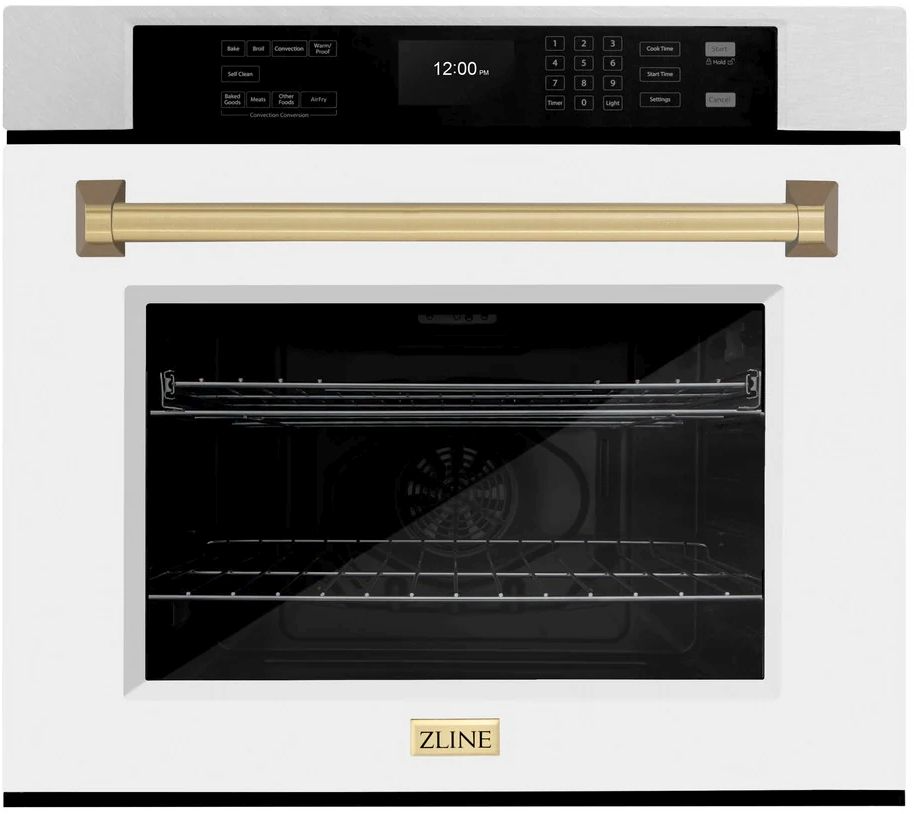 The ZLINE 30 in. Autograph Edition Professional True Convection Single Wall Oven with Air Fry and Self Clean in Satin Stainless Steel with White Matte Door and Champagne Bronze Handle (WASSZ-WM-30-CB) provides a professional culinary experience by pairing reliable, everyday performance with contemporary convection cooking capabilities and cutting-edge air frying technology.