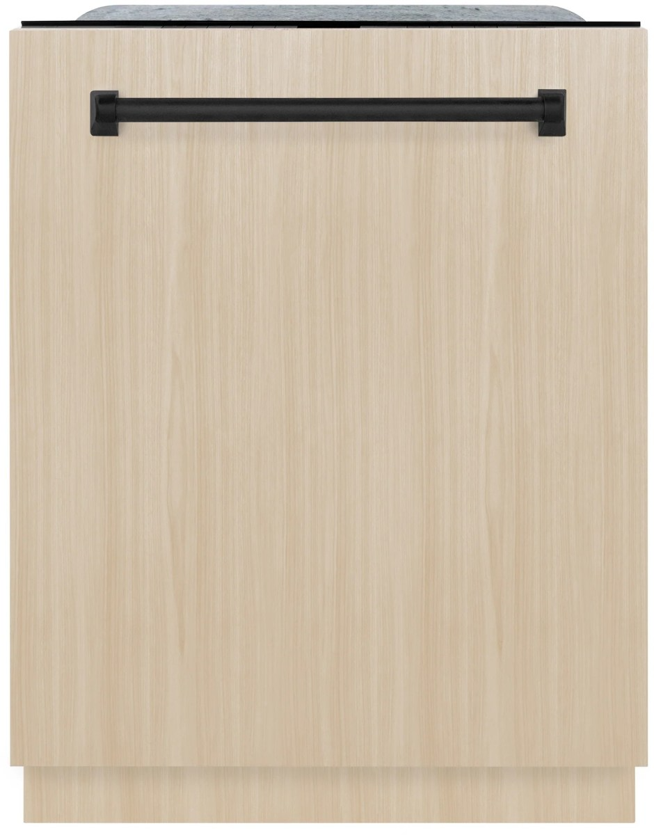 The ZLINE Autograph Edition 24"" Monument Series 3rd Rack Top Touch Control Tall Tub Dishwasher in Custom Panel Ready with Matte Black Handle, 45dBa (DWMT-24-MB) utilizes innovative DuraWash® technology and powerful energy-efficient performance to achieve optimal results. Encompassing limitless beauty, precision, and quality, the Autograph Edition Series creates a luxury look by pairing an elegant matte black handle with your own custom door panel.